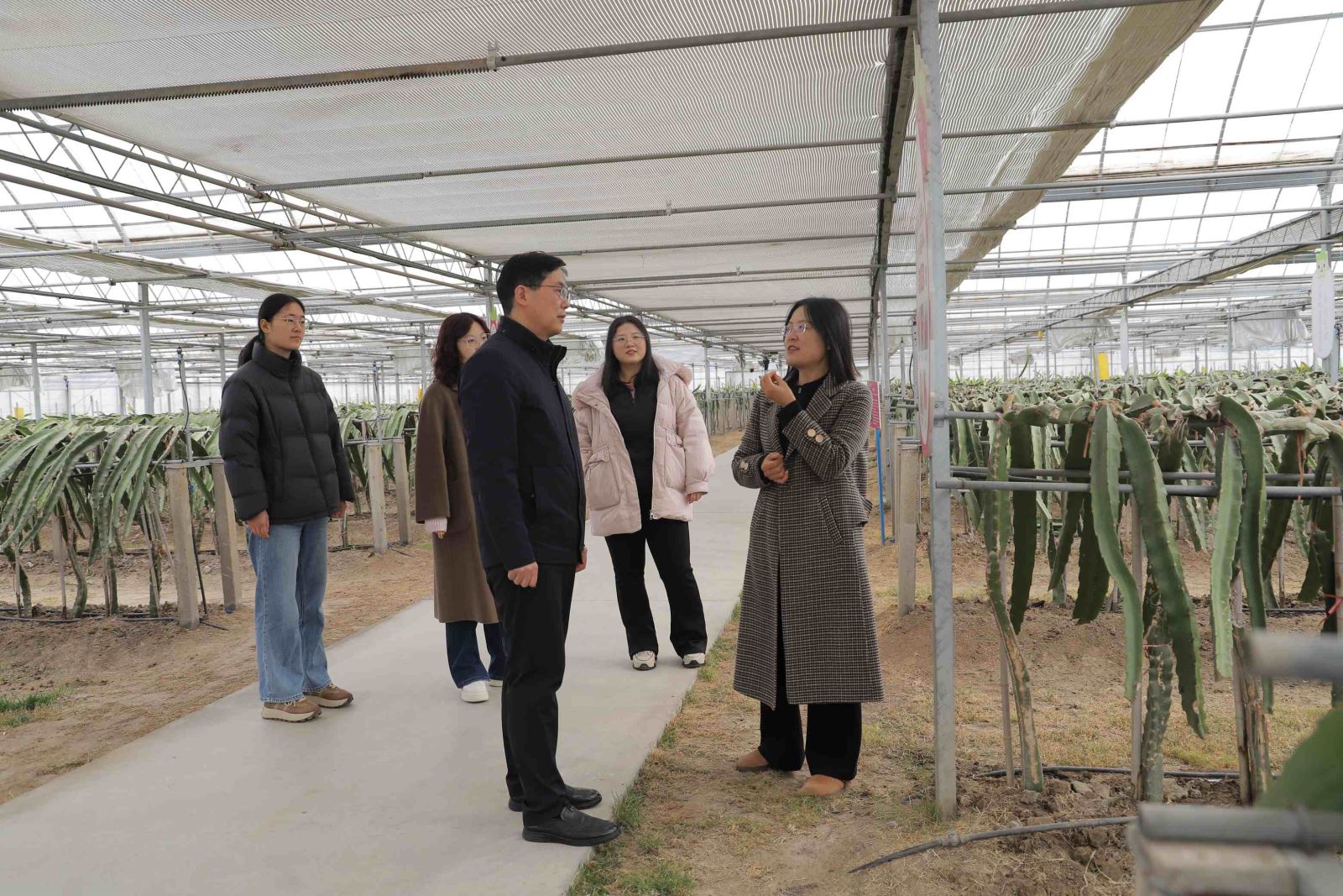 合庆火龙果向校方系统展示了其核心的“南果北种”智能化温室技术,包括:三层梯度隔空保温结构,实现对大棚温度的精准控制;雨水循环利用系统与水肥一体化设施,保障火龙果科学灌溉;以及臭氧杀菌技术、“一枝一果”标准化种植管理等多项先进技术。这些技术的集成应用,成功在上海实现热带火龙果规模化、高品质种植。